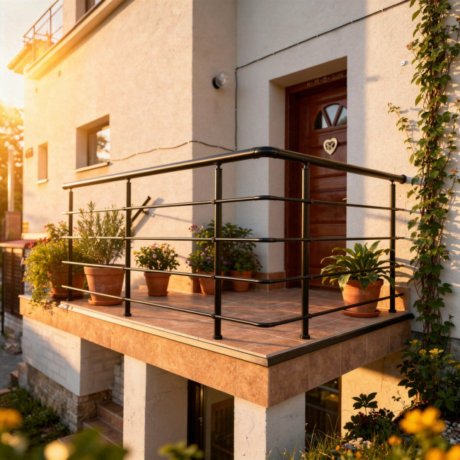 Hliníkové kulaté zábradlí model B1HRC v černé barvě pro terasu, s horním kotvením. Tento model obsahuje čtyři vodorovné výplně, které přispívají k modernímu a elegantnímu vzhledu.