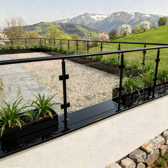 Zábradlí model E1HRC v černé barvě je hliníkové kulaté zábradlí na terasu a balkón s horním kotvením. Tento model je vybaven bezpečnostním sklem 4.4.2, které přispívá k modernímu a elegantnímu vzhledu.