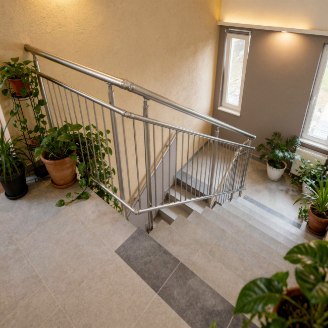 Hliníkové kulaté zábradlí na schody s bočním kotvením. Tento model je navržen pro flexibilní přizpůsobení a montáž na místě podle specifických požadavků prostoru.