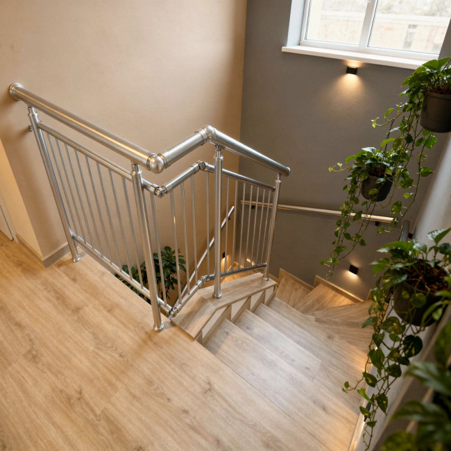 Hliníkové kulaté zábradlí na schody s horním kotvením do schodnice. Tento model je ideální pro bezpečné a esteticky příjemné řešení schodišť.