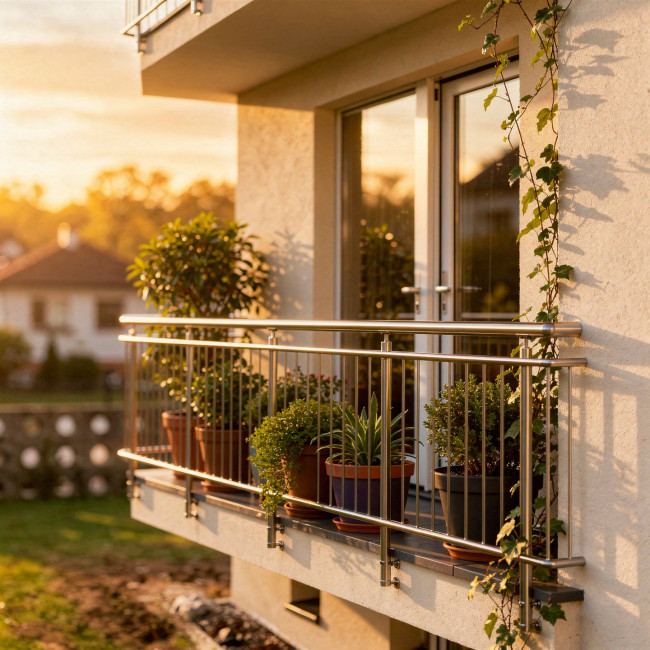 Hliníkové kulaté zábradlí na terasu a balkón s bočním kotvením poskytuje elegantní a moderní vzhled.