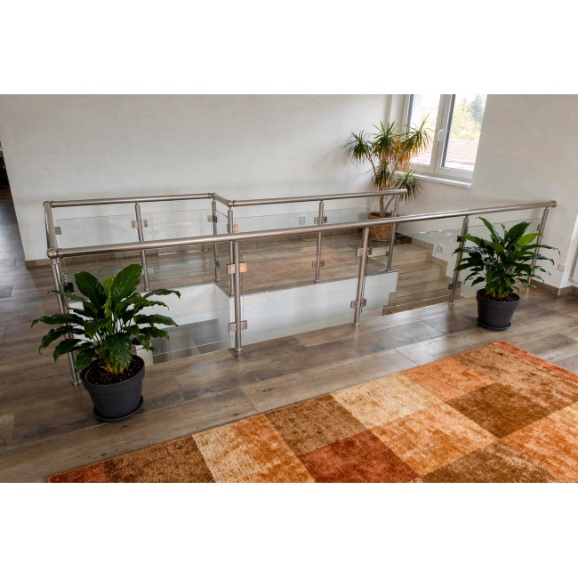 Zábradlí model E1HRB v barvě imitace nerez je hliníkové kulaté zábradlí na terasu a balkón s horním kotvením. Tento model je vybaven bezpečnostním sklem 4.4.2, které přispívá k modernímu a stylovému vzhledu.