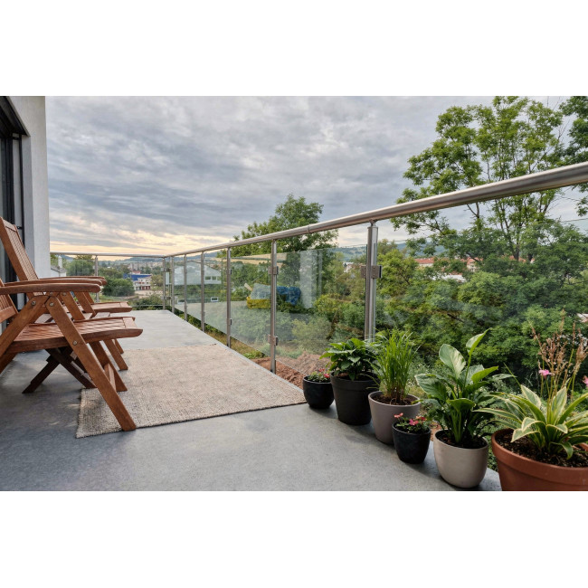 Zábradlí model E2 v bočním provedení v barvě Silver je hliníkové kulaté zábradlí na terasu s horním kotvením. Tento model je vybaven bezpečnostním sklem 4.4.2, které přispívá k modernímu a estetickému vzhledu.