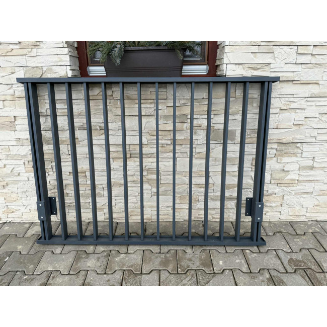 Hliníkové zábradlí na Francouzské okno v barvě Antracit. Zábradlí je navrženo pro okno kde je šíře špalety do 1000mm. Kotvení je z čela Fasády na závitovou tyč M8.